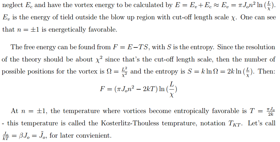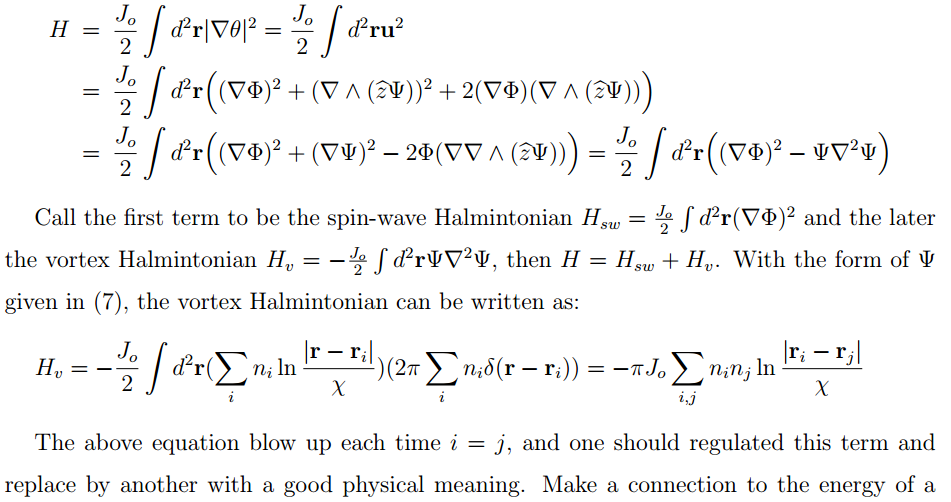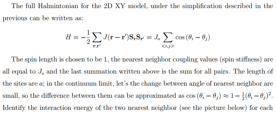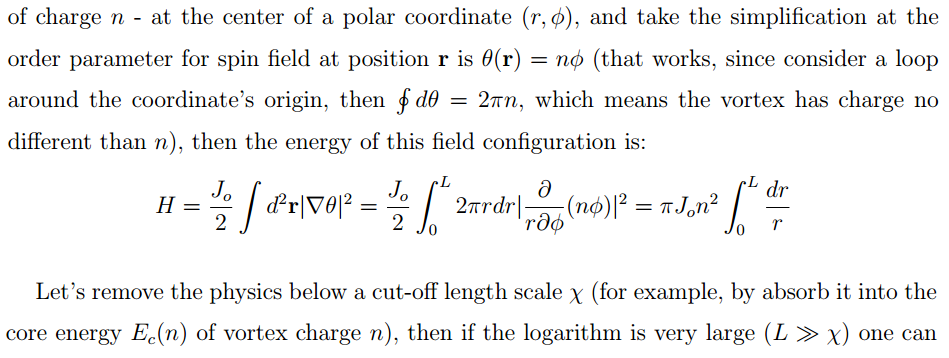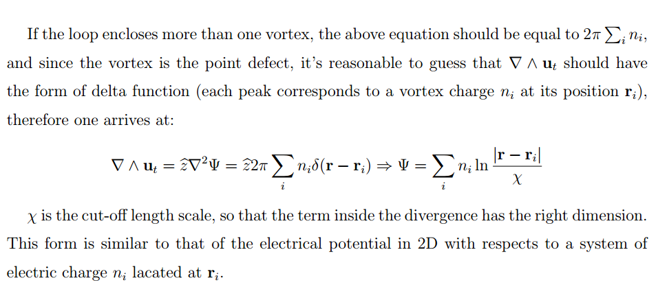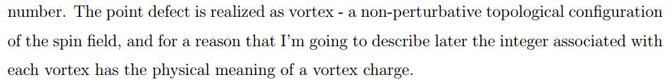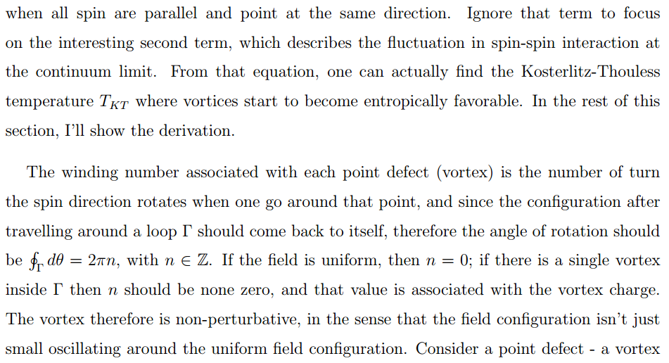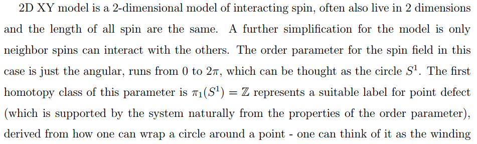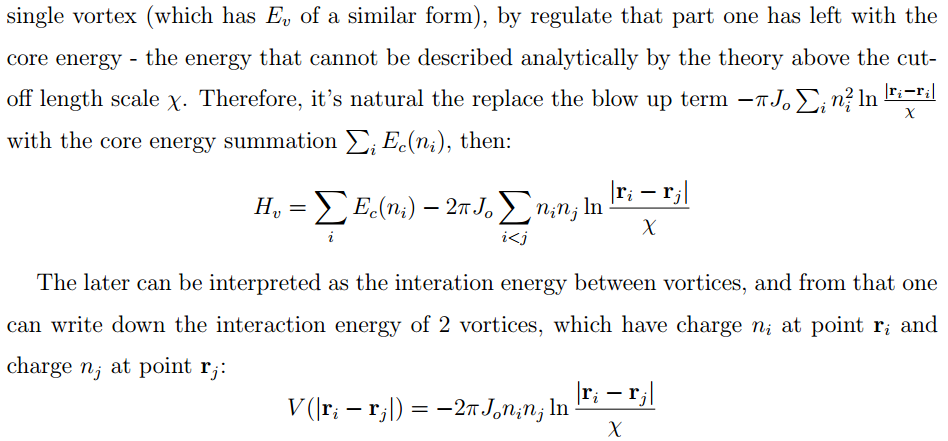 The interaction between topological defects is a mix between perturbative and non-perturbative behaviors of field theory, therefore it's very interesting to take a look at it. Consider a simple 2D XY model and read-off the interaction of topological defects from it.