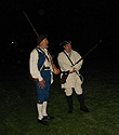 Having acquired an excellent viewing spot, we settled down to wait the 45 minutes or so in the cold and dark until things started happening. During this period of time some of the townspeople and minutemen spent time milling around the common in small groups. When we first got there, we saw a couple minutemen wander by asking if thre were pickeys yet. Gradually more people appeared, including women carrying candle lanterns. One minueman in green kept wandering and telling people "Don't worry the heat will be one soon." At this point, Captain Parker and some of the militia are waiting across the green in Buckman's Tavern for word from their scouts of the impending arrival of the British. At this point, it's still pretty dark and kind of cold. Wiser spectators had brought blankets and chairs. And hot drinks. The only way I could frame pictures on my digital camera was by observing where my subjects were in relation to the electric lights, which were the only things that showed up on my viewfinder.