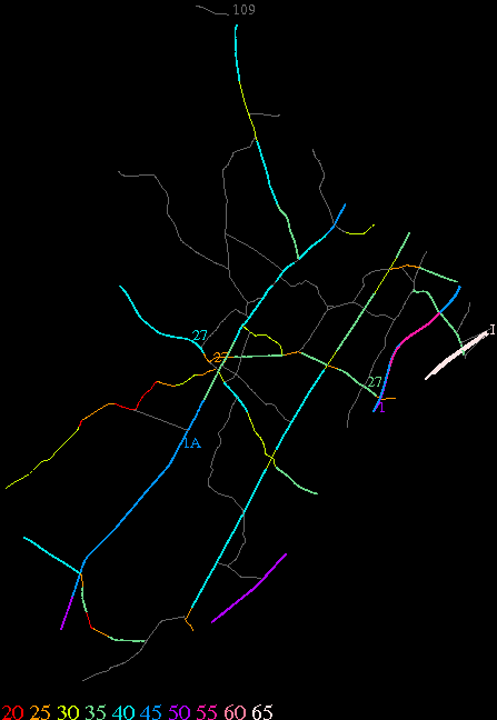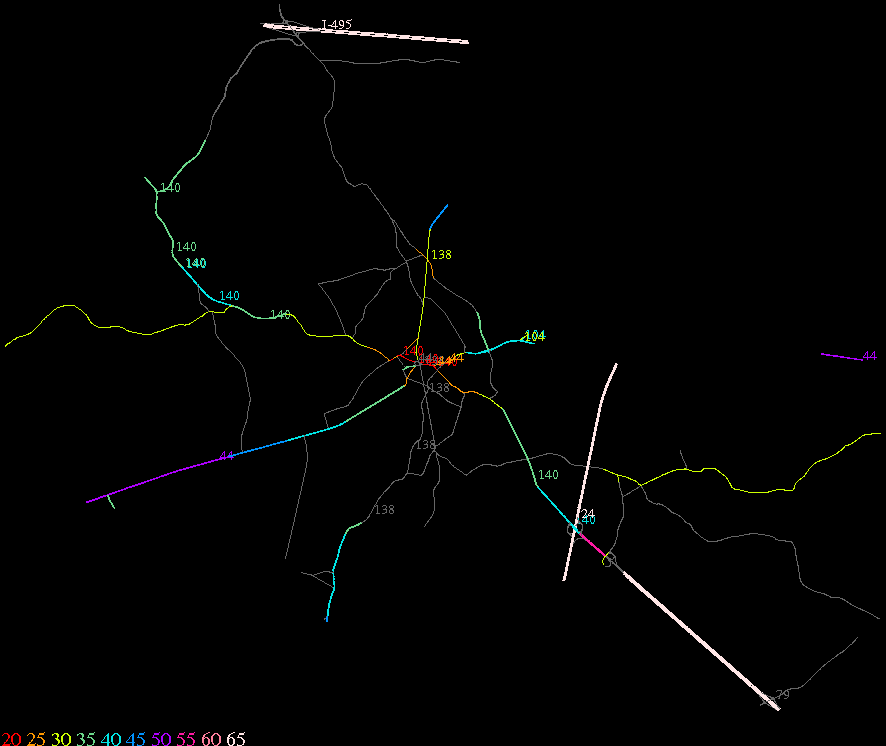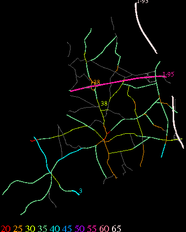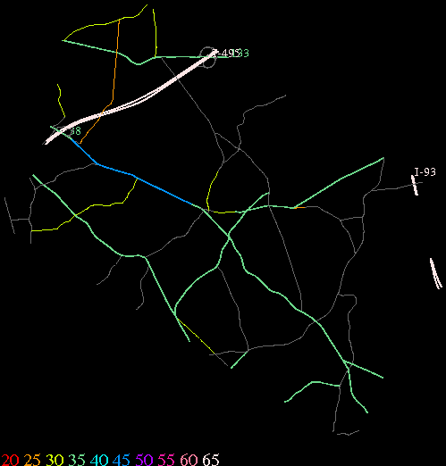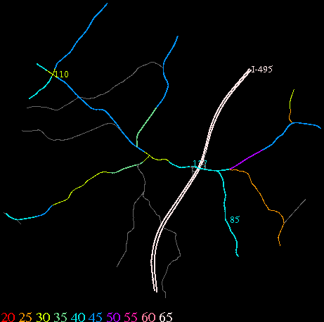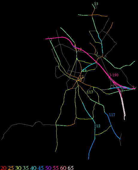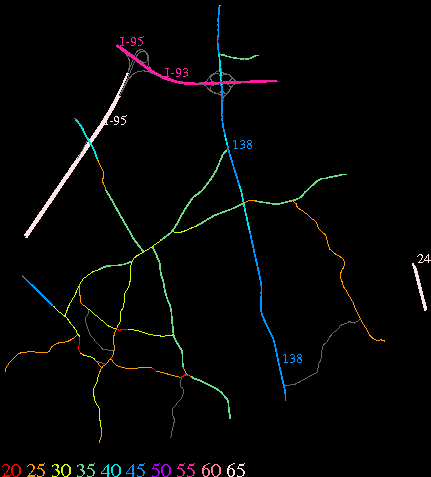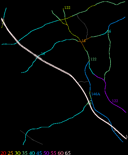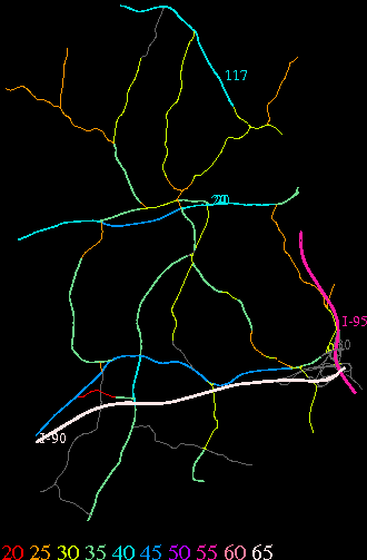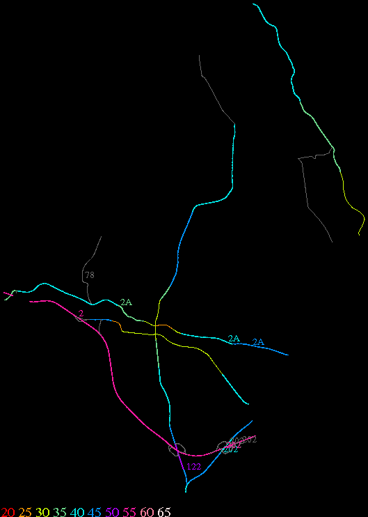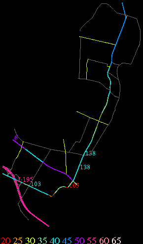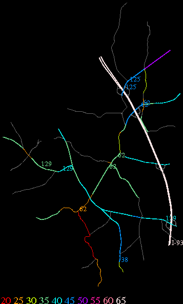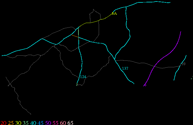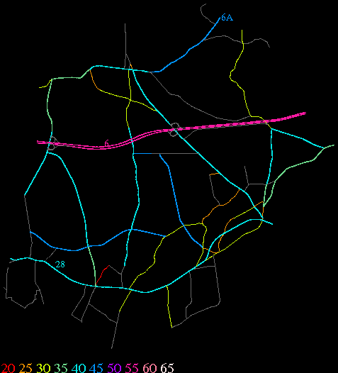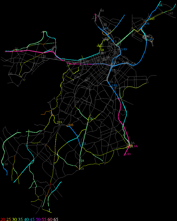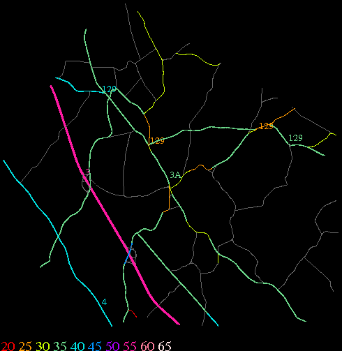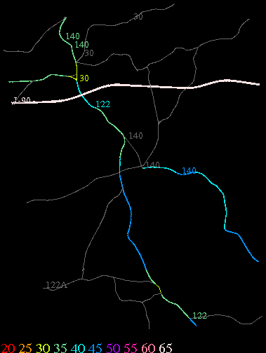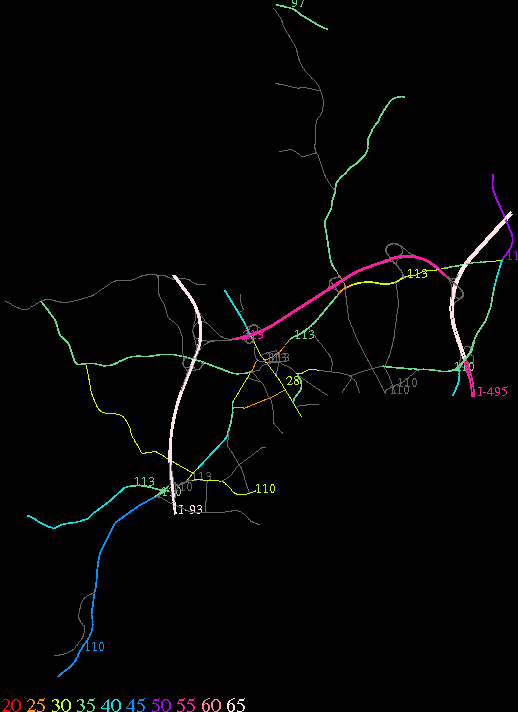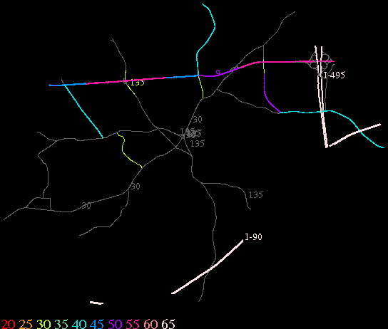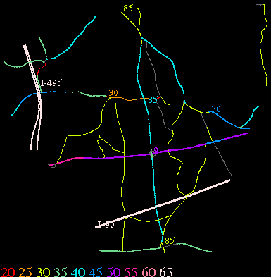 Links lead to maps of roads in Massachusetts cities and towns. The scale is 30 meters per pixel. Color indicates posted speed limit.