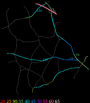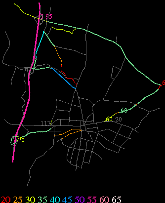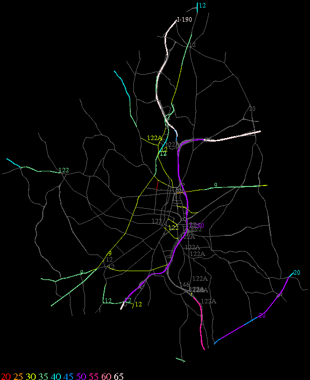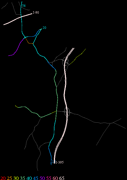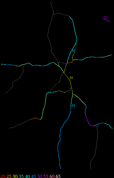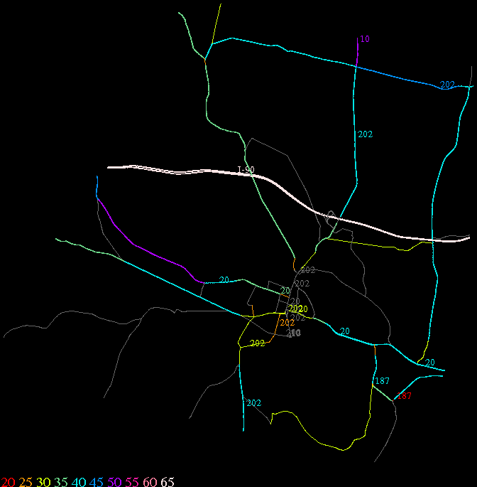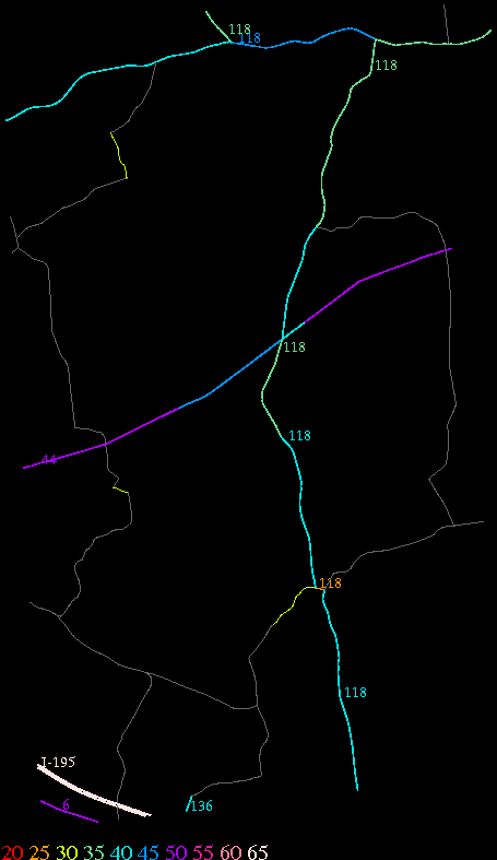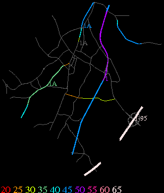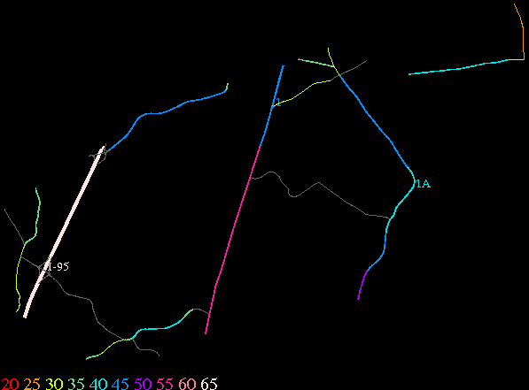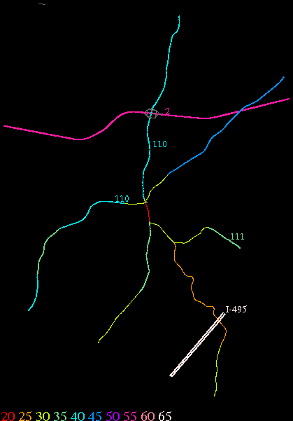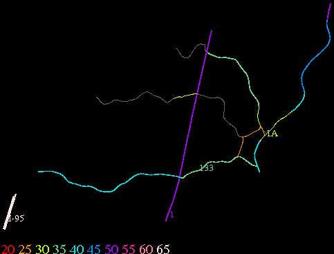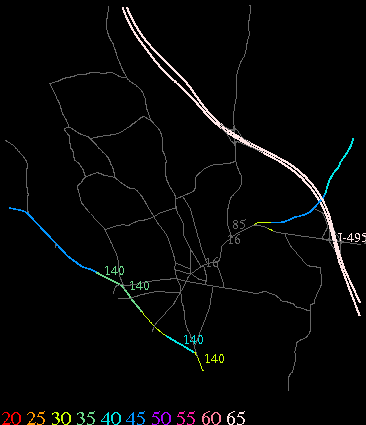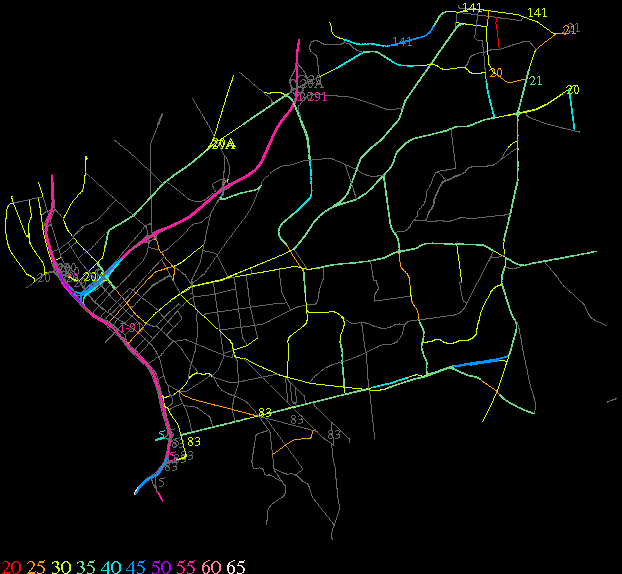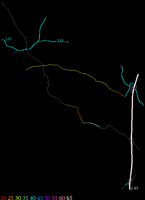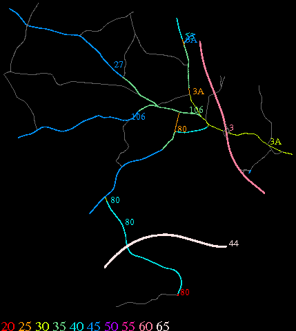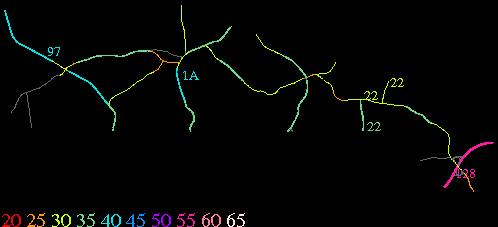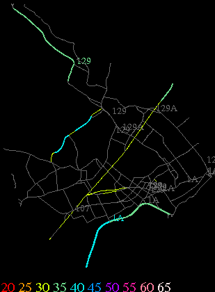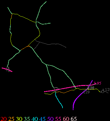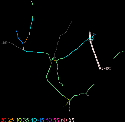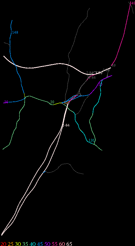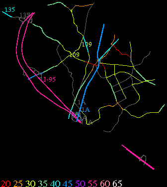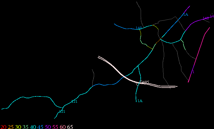 Links lead to maps of roads in Massachusetts cities and towns. The scale is 30 meters per pixel. Color indicates posted speed limit.