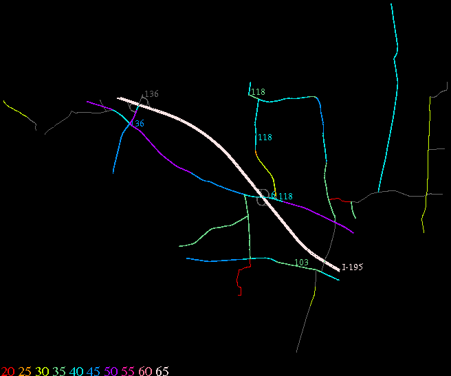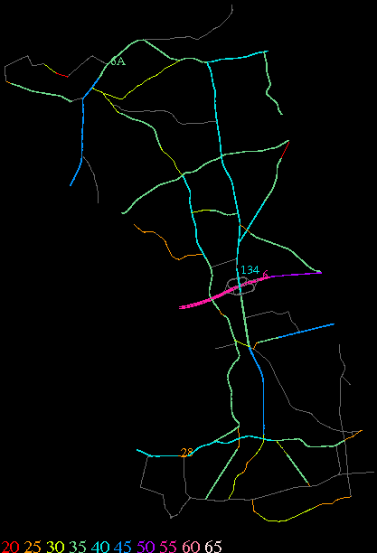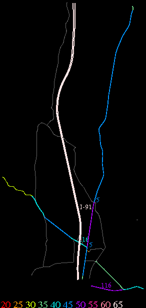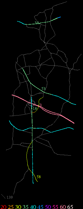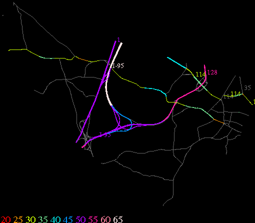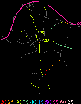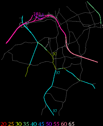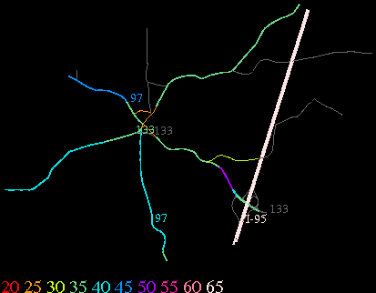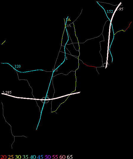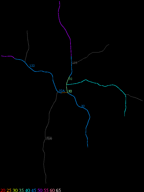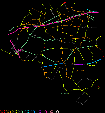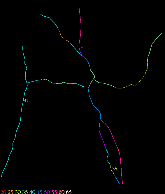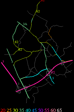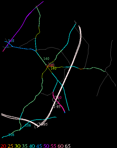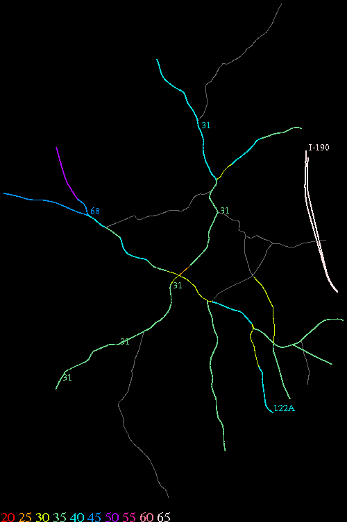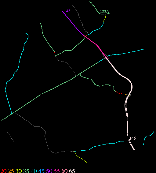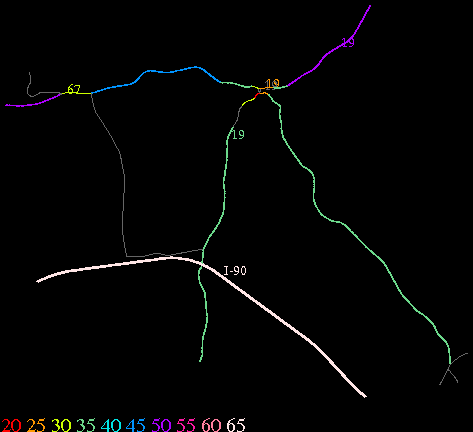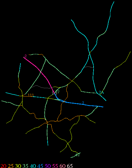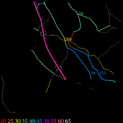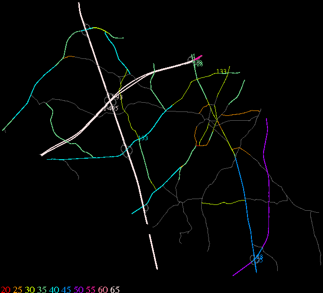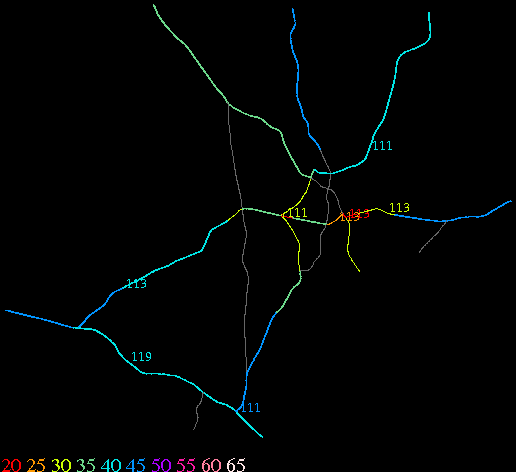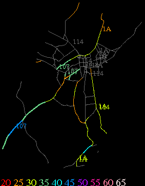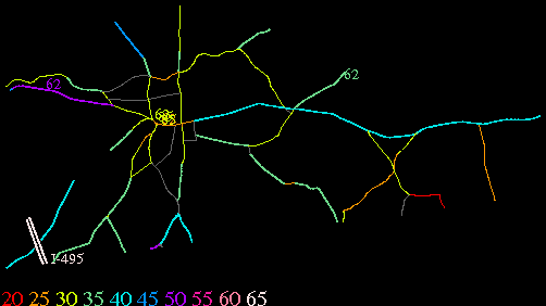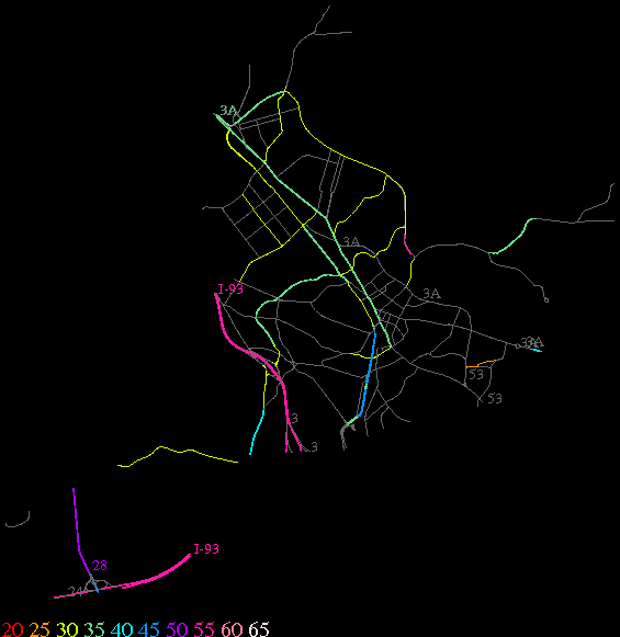Links lead to maps of roads in Massachusetts cities and towns. The scale is 30 meters per pixel. Color indicates posted speed limit.