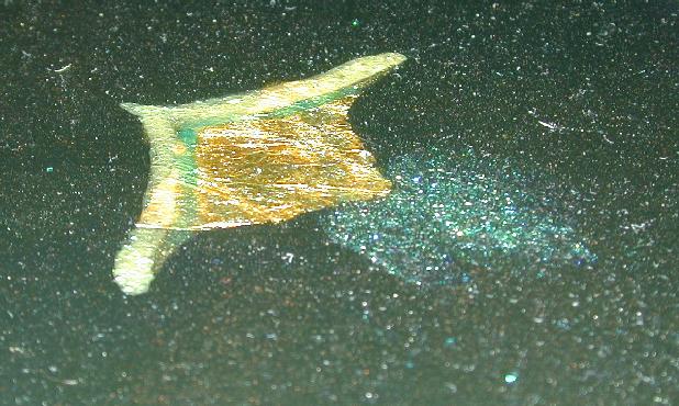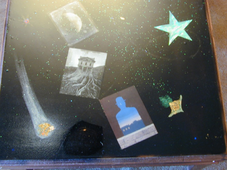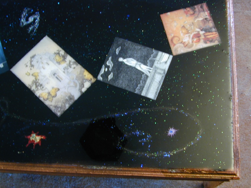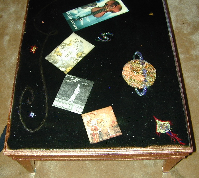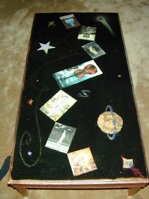 my roomate maggie left this coffeetable when she moved out. it was physically sturdy, but the finish was ruined, so i coated it in textured spraypaint, painted the sides and legs copper, the top black, pasted some postcards to it and painted a galactic scene on the background, mostly in nail polish, along with glitter, copper leaf, and origami paper. it turned out much better than i expected. then i coated the entire top in "envirotex lite" which is a two-part epoxy resin which makes a lovely glossy thick (1/8") coat over the whole thing. very nice stuff, though i'm sure it's not good for the brain cells.