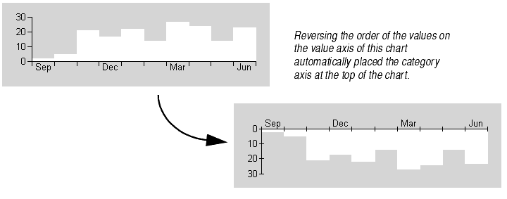 You may choose to display the categories or values on an axis in reverse order. This may help emphasize a particular aspect of your chart or it may simply save you from having to edit the chart's data range.
