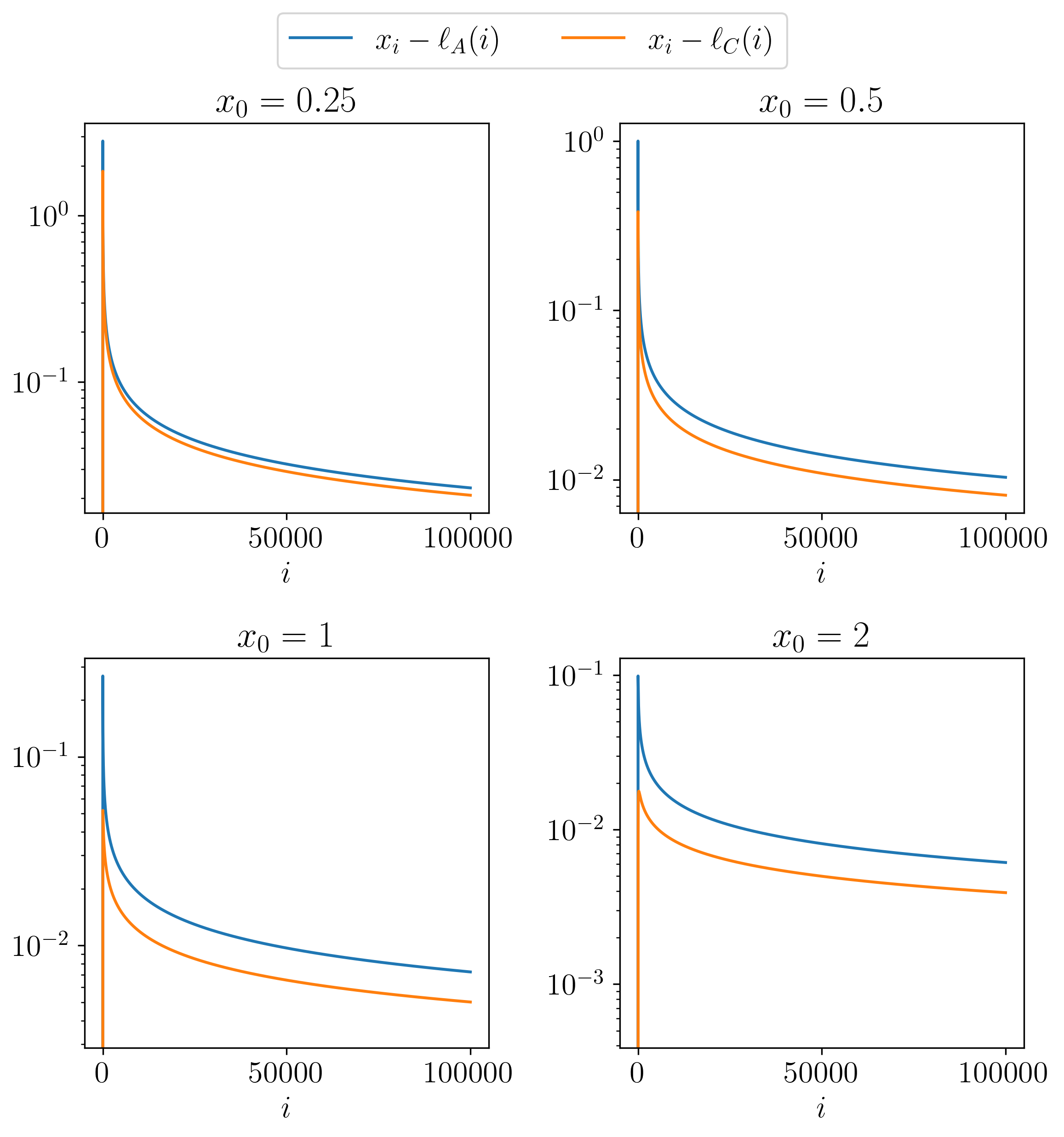 Propositions B and C appear to provide much better bounds on the growth of the sequence of interest. Below, we initialise the sequence at a collection of 4 values and plot the error to the actual values i.e., \(x_{i} - \ell(i)\), and \(u(i) - x_{i}\), where \(\ell, u\) are lower and upper bound functions respectively.